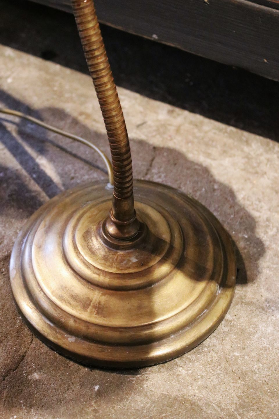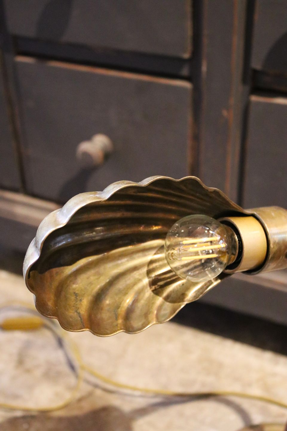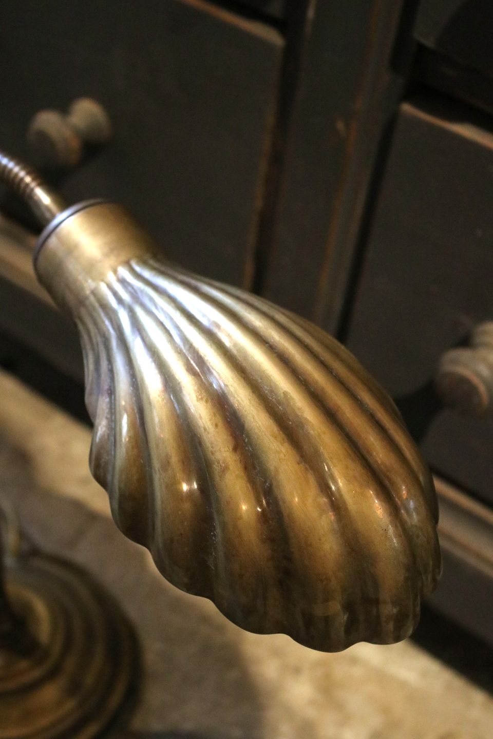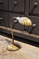 Gammel bordlampe i messing med musling formet skærm. Ca. H: 40cm. Lampen er monteret med ny ledning og afbryder.
