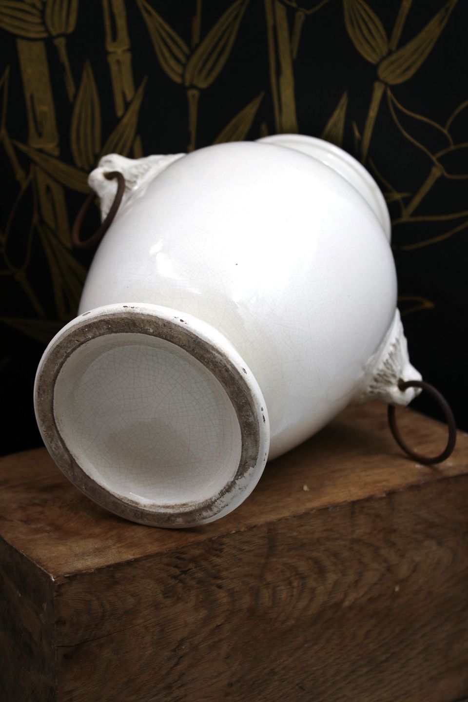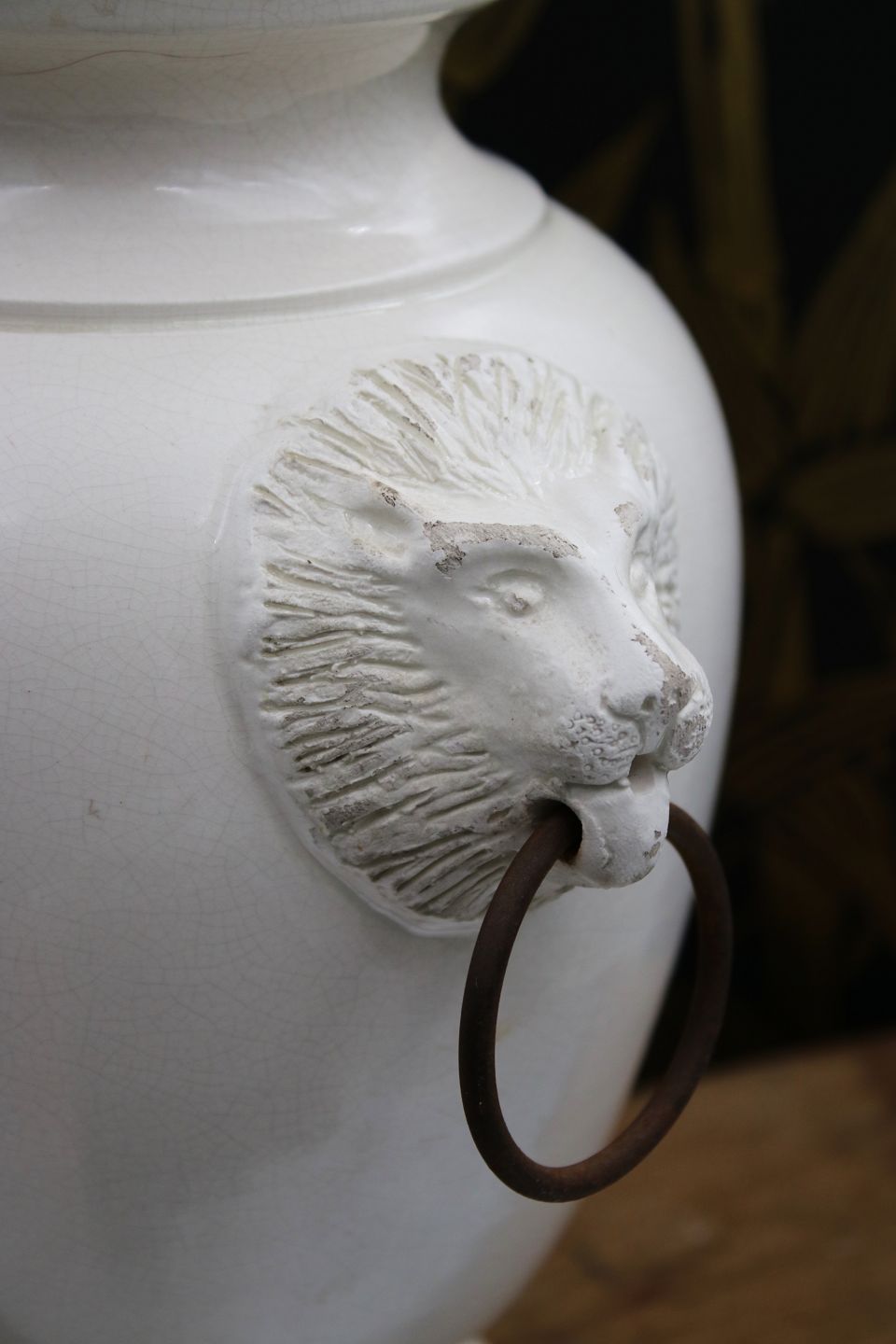 Gammel glaseret stentøjs lågkrukke med løvehoveder på siden. Krukken har en fin gammel patina og måler : H: 32cm.