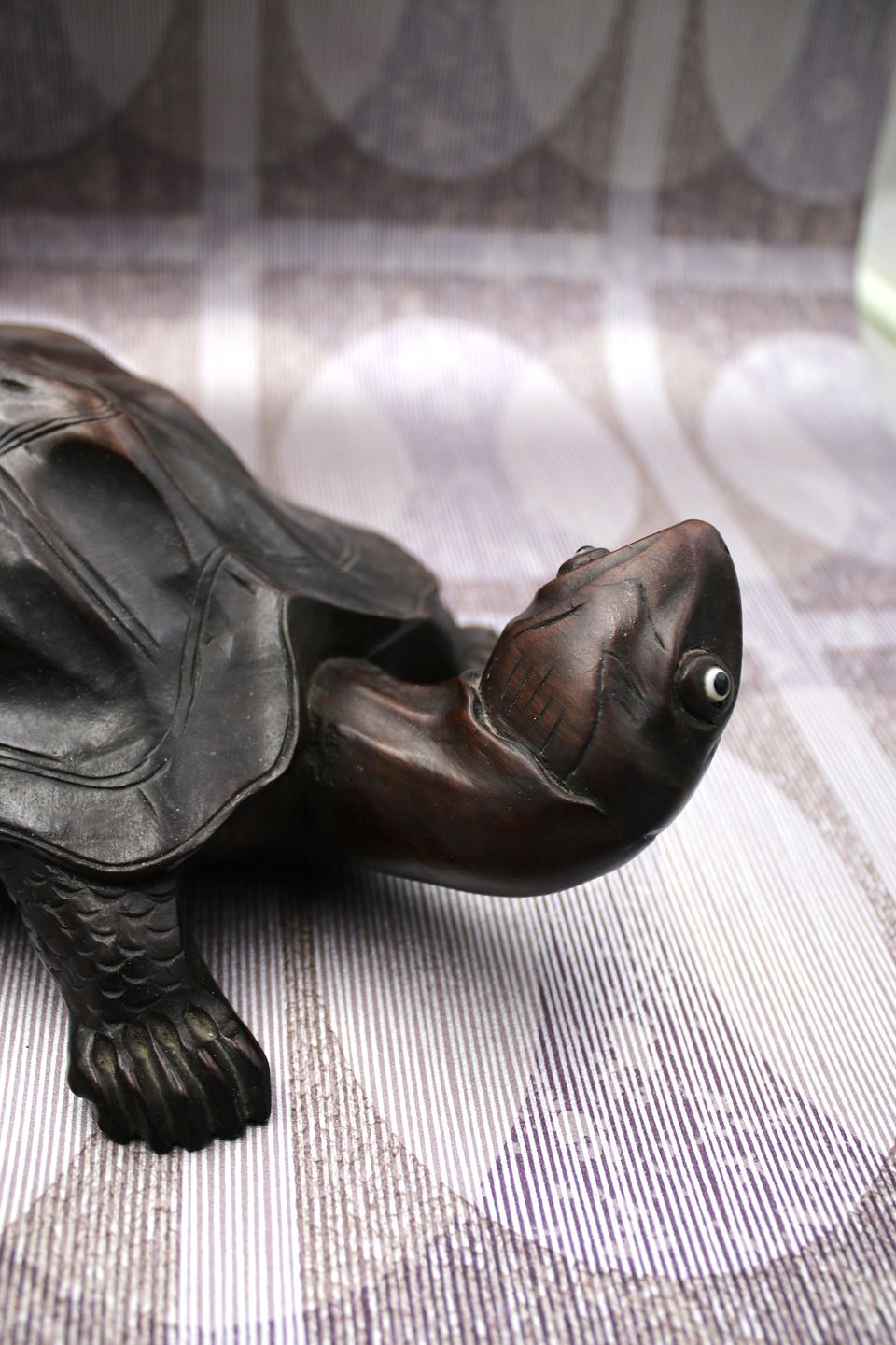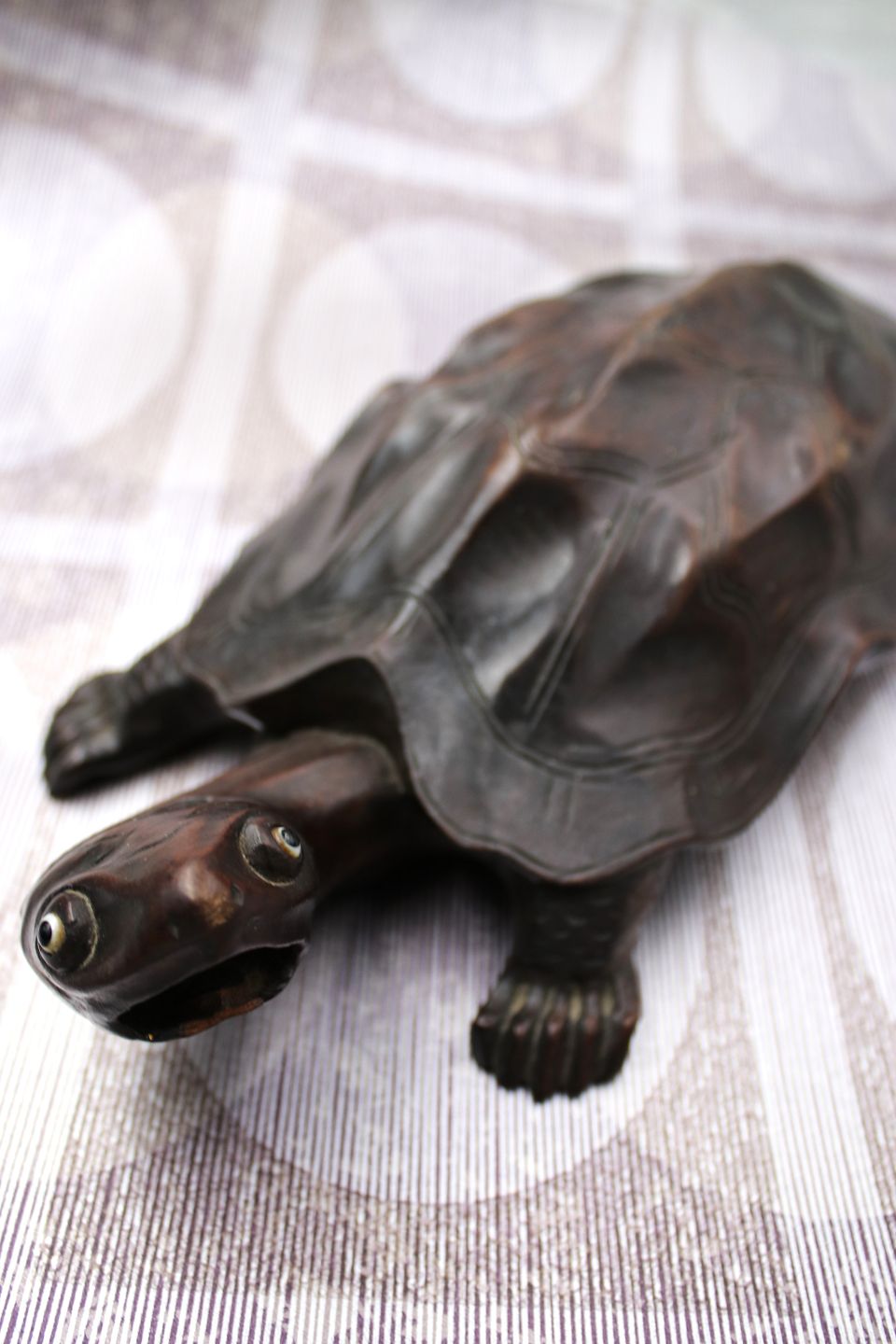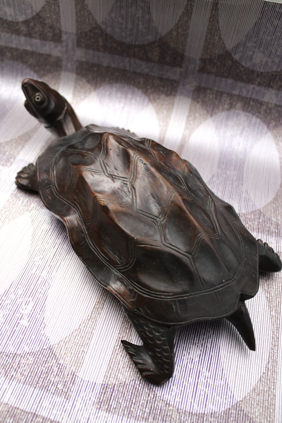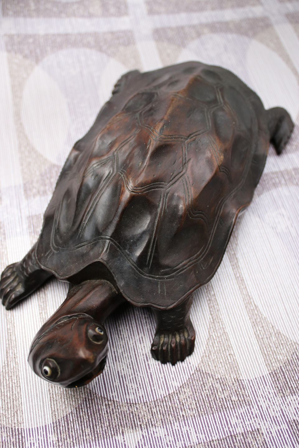 Gammel skildpadde udskåret i massivt mørkt træ med en rigtig fin patina. H: 7,5cm. L: 30cm. B: 15cm.