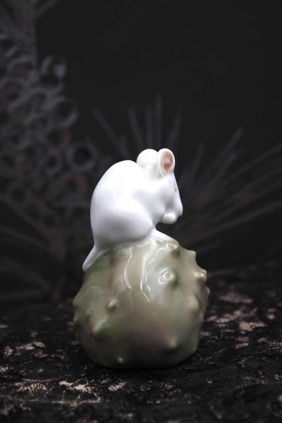 Lille hvid mus siddende på en kastanje , fin lille porcelænsfigur fra Royal Copenhagen. H: 6,5cm. Dekorationsnummer: RC511. fra 1893-1900.