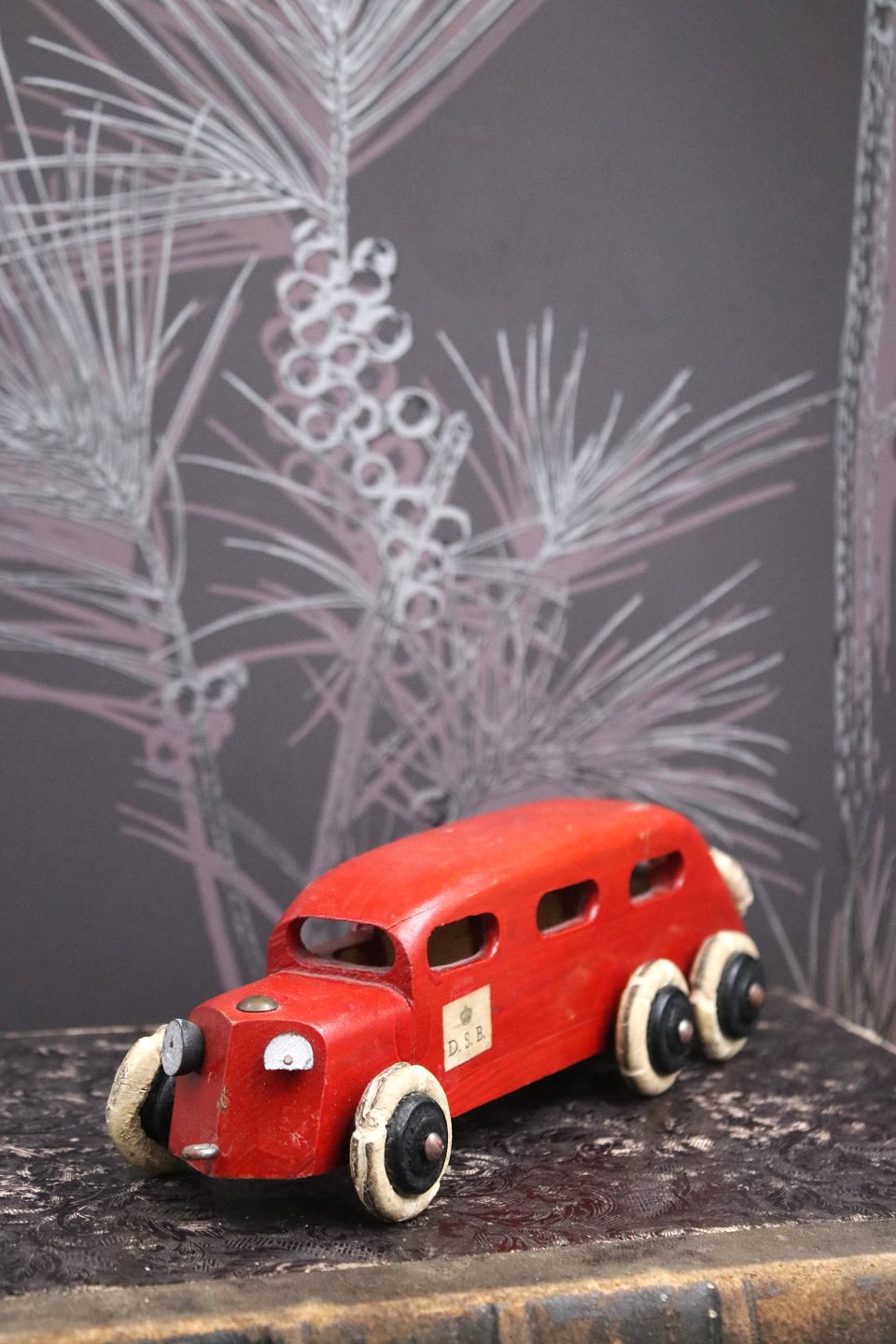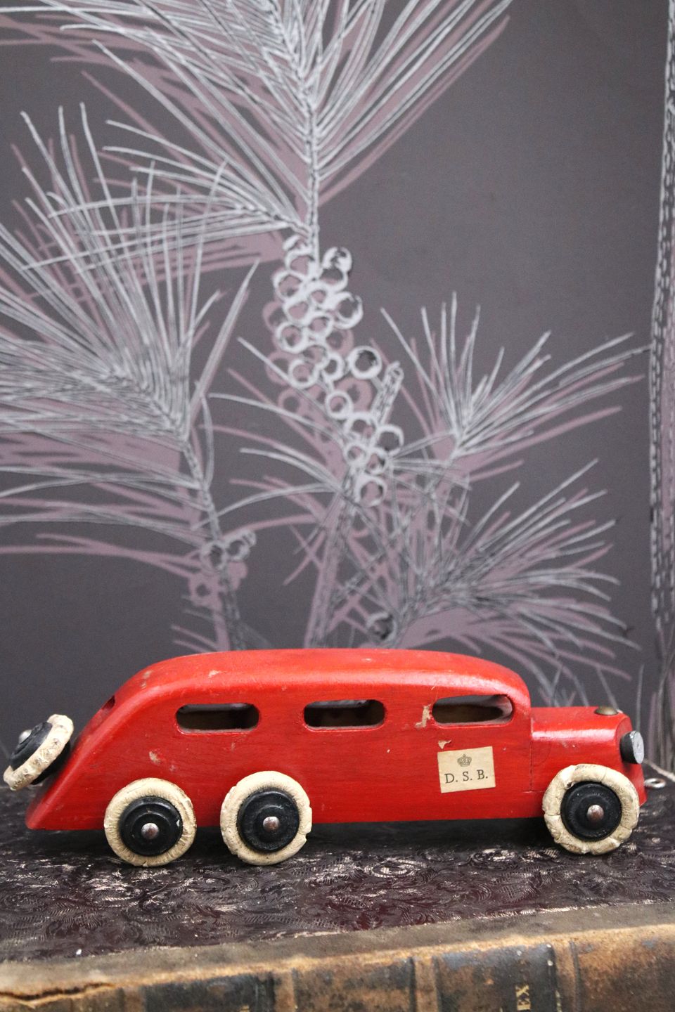 Dekorativ, gammel vintage rutebil i rødmalet træ med DSB skilt på døren og en fin gammel patina. H: 6,5cm. L: 22,5cm. Emne nummer: Vintage træ bil