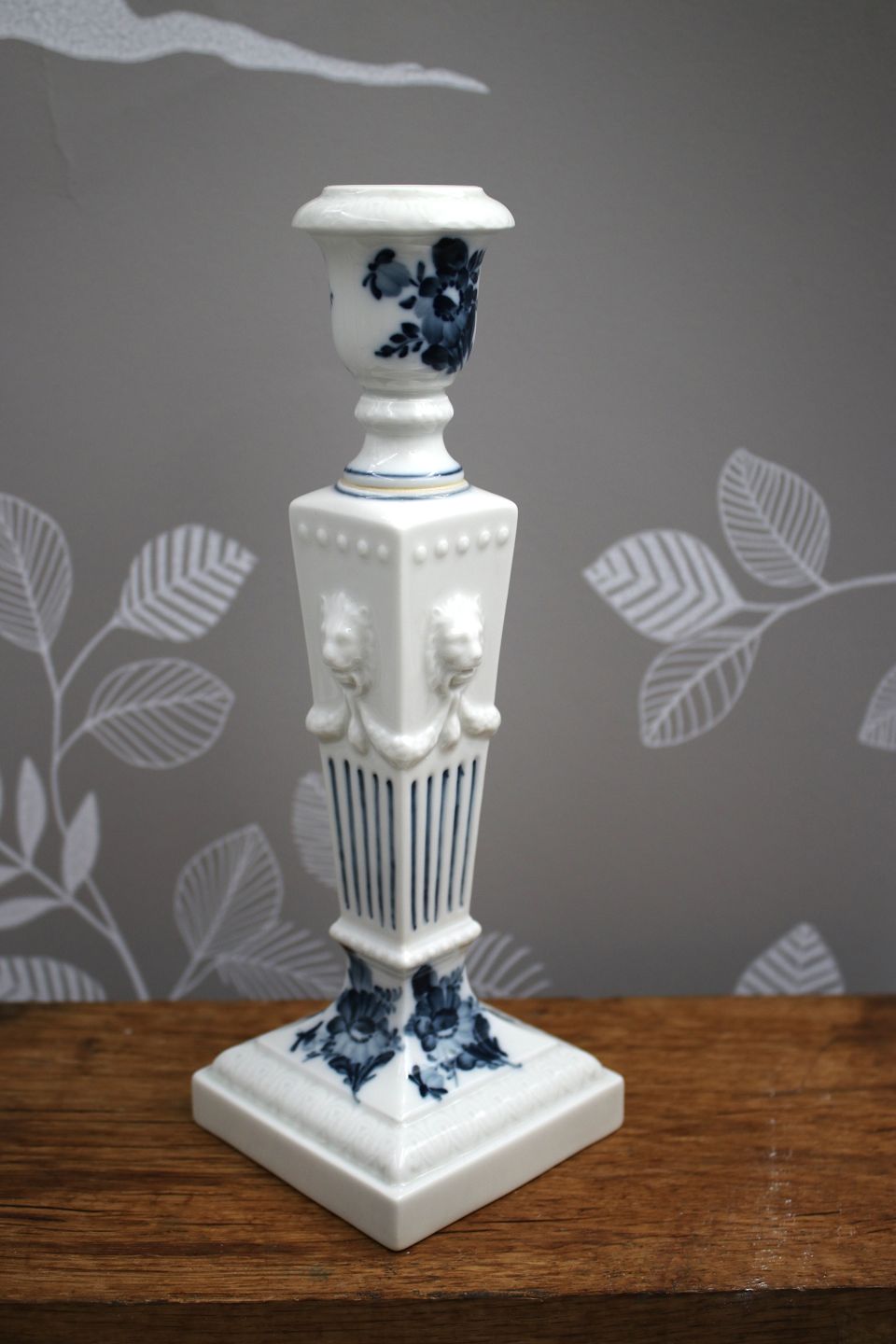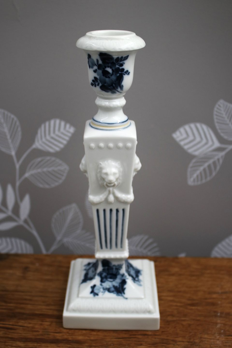 Lion candlestick in Blue Flower from Royal Copenhagen, with lion heads on the side. H: 22.5cm. Decoration number: 45/15. 1.sorting.
