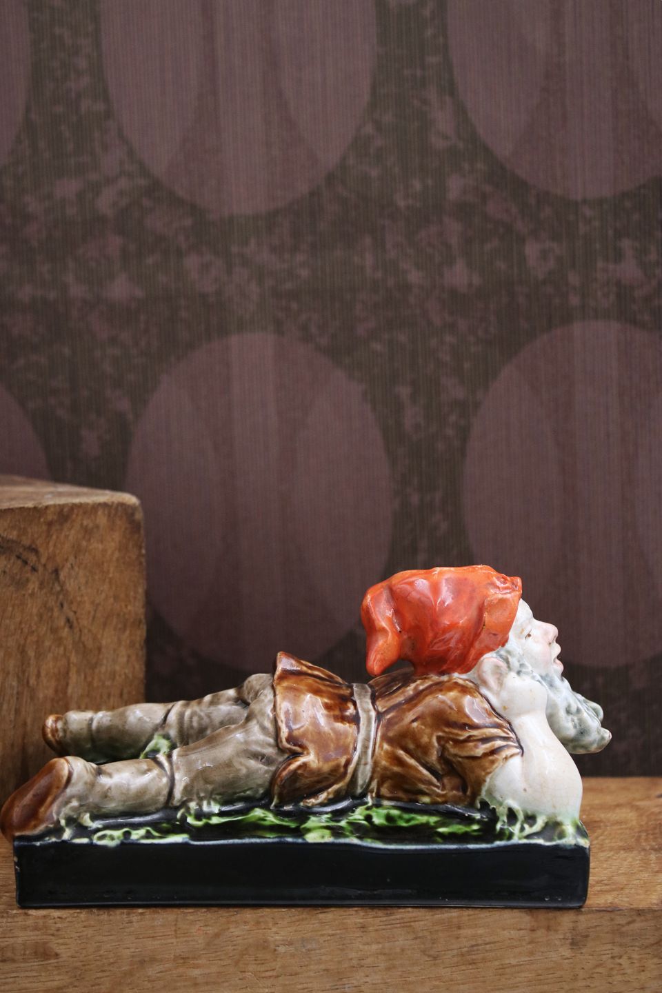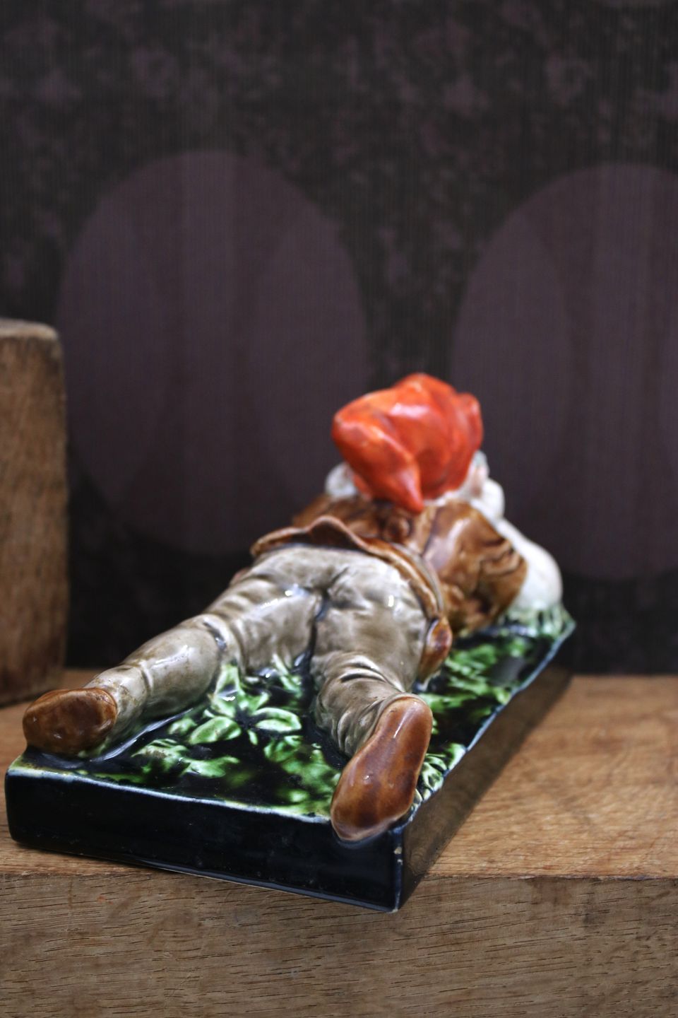 Antik , tysk keramik nisse i fin majolica glasur fra ca. 1880. H: 9cm. L: 17cm. B: 9cm.