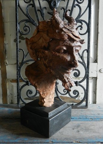 Massimo Facheris. Faun. Figur af terrakotta på sokkel af sortmalet træ. Sign. M. Fache. H. 47 cm. Mindre afslag. Massimo Facheris er en 53 årig italiensk skulptør bosiddende i Bergamo.