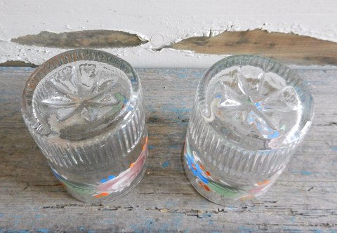 Par meget smukke 1800tals emalje bemalede øl glas antageligt Holmegaard. Fastblæst riflet bund, otteoddet bundstjerne. Højde 9,5cm. Diameter 7cm. Fremstår i perfekt stand.