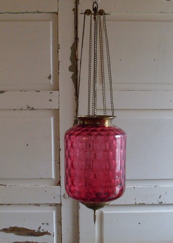 Ampel i hindbærfarvet glas med øjet optik fra Fyens glasværk.