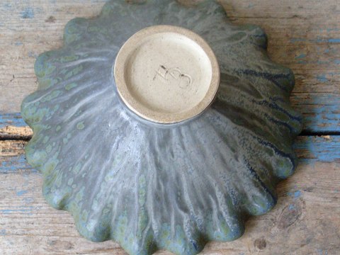 Smuk Arne Bang skål i flot grøn-blå-grå glasur. Højde 9,5cm. Diameter 23cm. Stemplet AB Fremstår i hel og fin stand.