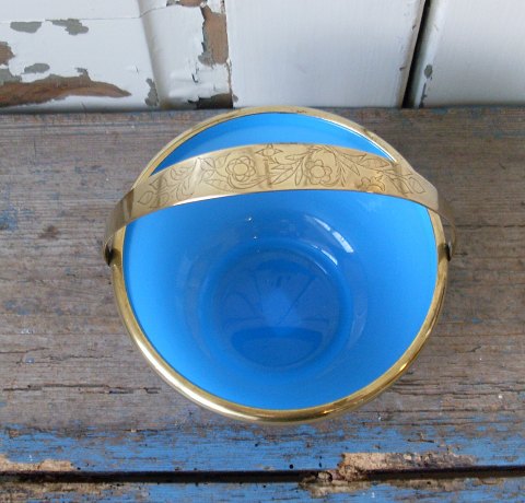 1800tals lyseblå opaline sukkerskål med smukt dekoreret messing hank. Højde 7cm. Diameter 12cm.