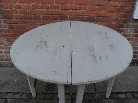 Par smukke gråmalede 1800tals halvrunde konsol borde. Kan sættes sammen til et rundt bord. Mål 57x115cm. Højde 74cm.