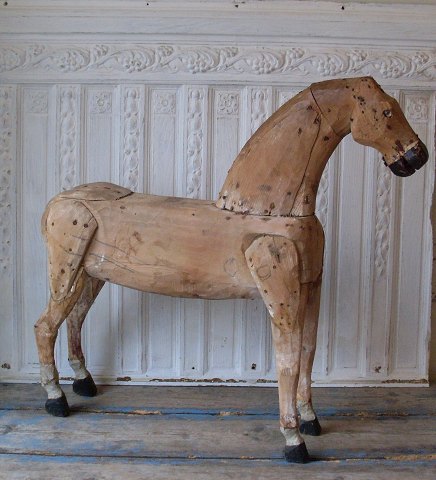Skøn stor gammel træ hest. Hesten har en gang været beklædt med skind, femstår med et fint råt udtryk. Højde 64cm. Længde 65cm.