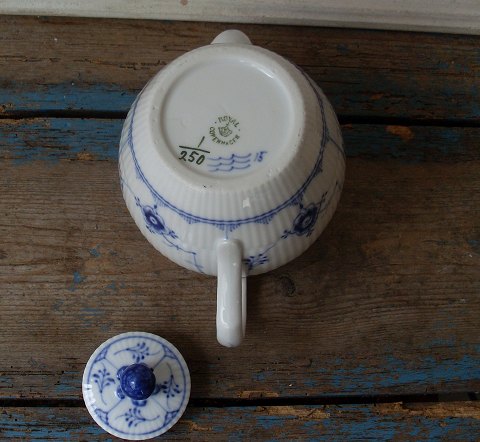 Royal Copenhagen Musselmalet riflet sjælden tekande No. 250, 1. sort. Højde 14cm. Bemærk den fint udformede tud. Produceret mellem 1898-1923