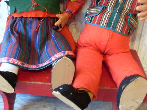 Par skønne gamle butiks nisser i sjælden stor størrelse. Nisse mor mangler to fingre, hånden kan sættes så det ikke ses! Højde 75cm.