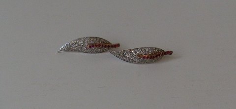 Pair of leaf-shaped pendants in 8 kt white gold adorned with numerous rubies and diamonds