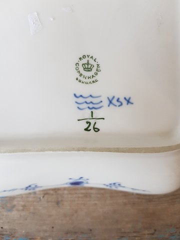 Royal Copenhagen Musselmalet riflet firkantet skål No. 26, 1. sort. Mål 21 x 21 cm. Højde 6 cm.