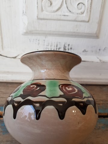 Kähler vase med kohorns dekoration. Fremstår med reperation - se billed. Signeret HAK - Denmark. Højde 10, 5 cm.