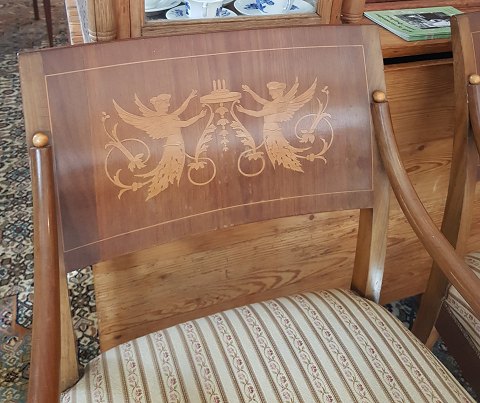 Par Empire armstole i mahogni med flot intarsia arbejde. Højde 85 cm. Bredde 55 cm. Sæde dybde 48 cm.