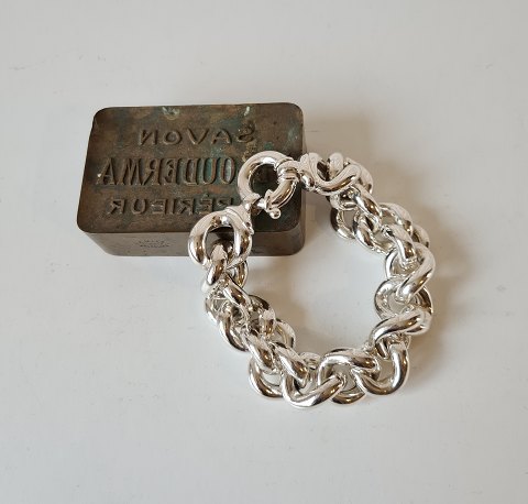Smukt kraftig armlænke i sterlingsølv Stemplet: 925 Længde 23,5 cm. Bredde 20 mm. Trådtykkelse 6 mm. Vægt 89 gram.