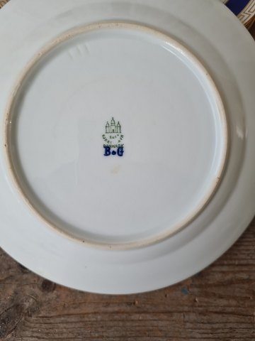Sæt på 6 B&G middagstallerken dekoreret med kongeblå fane, græsk evighedsmønster og våbenskjold i guld.