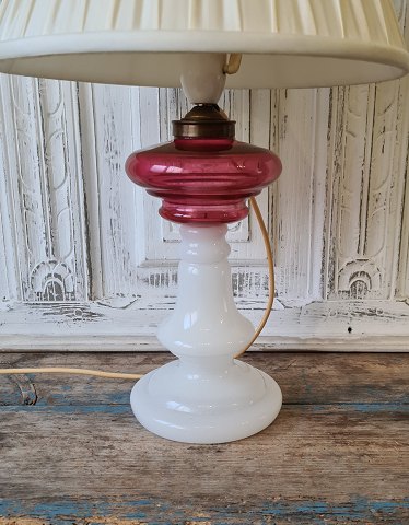 Beautiful 1800s opaline lamp with oil container in pink / raspberry colored glass. Remodeled for electricity.