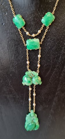 Collier i 18 kt guld med smukt udskåret jade og Akoya perler