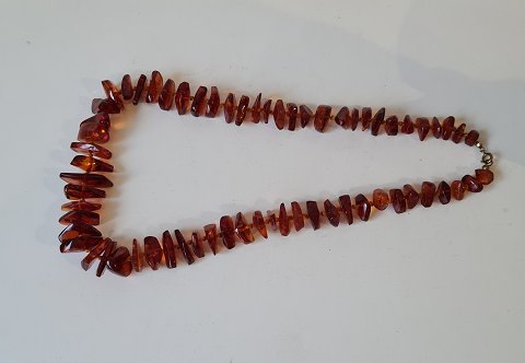 Lang halskæde i poleret rav Længde 61 cm. Ravstykkerne variere i størrelse fra 1 til 3,3 cm. Vægt: 66 gram.