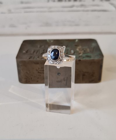 Beautiful vintage sapphire and diamond ring in 18 kt gold. Beautiful dark blue sapphire surrounded by 14 old mine cut diamonds. Dimensions of the rosette itself: 4 x 5 mm. Stamp: 770 Ring size: 58