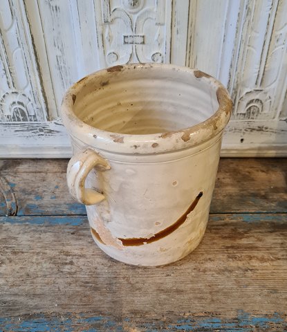 Beautiful old earthenware jar with beautiful cream-colored glaze. Appears with glaze defects on one side - see picture.