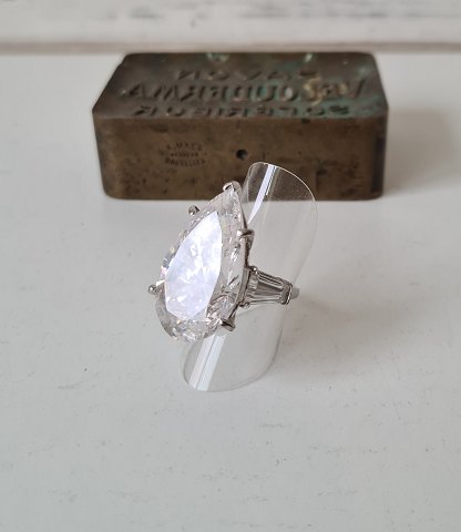 Cocktail ring i sterlingsølv med stor pear slebet klar sten flankeret af to mindre baguette slebne klare sten.