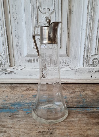 Small wine jug in glass with nickel-plated mounting, decorated with sandings of moons and stars. Height 21 cm.