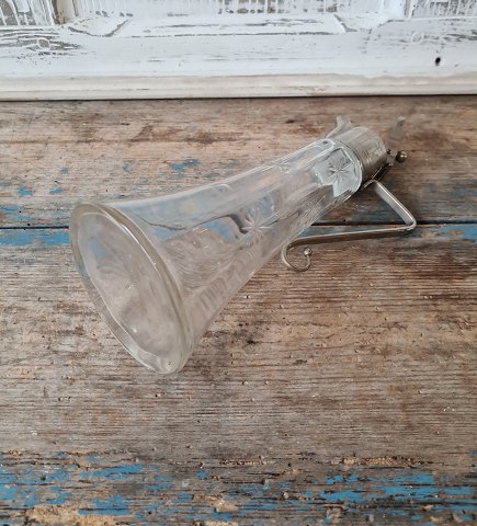 Small wine jug in glass with nickel-plated mounting, decorated with cuts of moon and stars 21 cm.