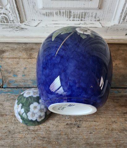 Royal Copenhagen Art Nouveau lågvase dekoreret med jordbærblomster, jordbær løv på blå bund. Bemalet af Else Hasselriis 1878-1953 |