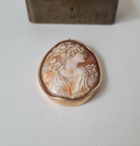 1800s large cam pendant set in 8 kt gold. Very beautifully wound. Appears unstamped, but acid tested to a quantity of 8 kt. M easures 3.8 x 5 cm.