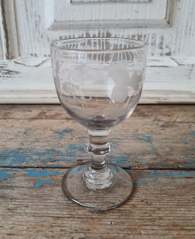 Vinglas med rund kumme på stilk med knap, dekoreret med matslebet vinløv med tre drueklaser.