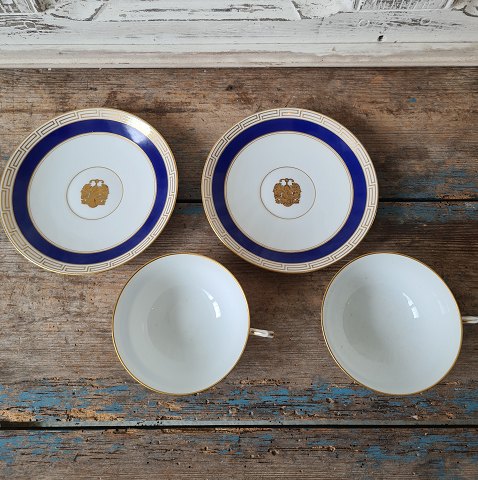 Sæt på 11 B&G tekopper dekoreret med kongeblå fane, græsk evighedsmønster og våbenskjold i guld.