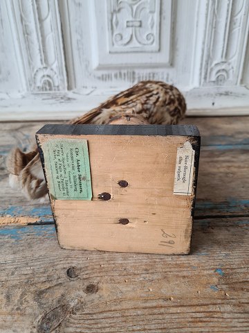 Stuffed forest horned owl mounted on birch stump By conservator Chr. Aaboe Sørensen Height 34 cm.