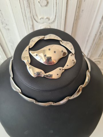 Smykke sæt bestående af halskæde, armbånd og broche udført i sterlingsølv prydet med stjerner i sort emalje. Halskæden og armbåndet kan sættes sammen til en lang halskæde. |