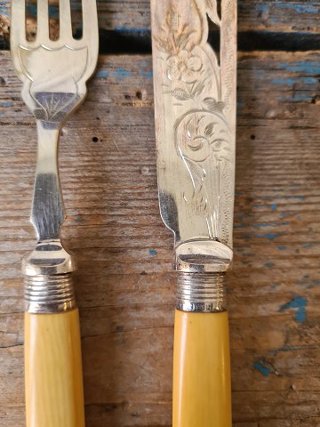 English silver-plated fish cutlery with bone handle for six people in original spoon. Length of knife 21 cm. Length of fork 18 cm.