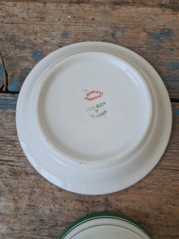 Par franske café brûlot kopper i kraftigt jern porcelæn dekoreret med grønne striber samt teksten Café Prévost