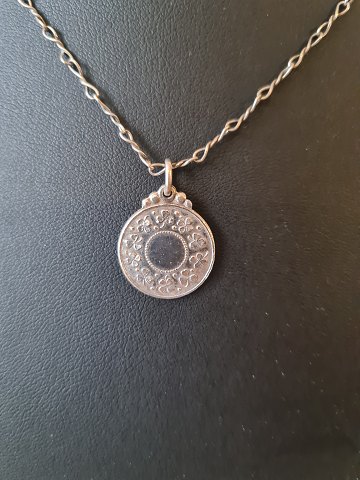 Halskæde i sølv med vedhæng dekoreret med trekløver på den ene side og Fadervor på den anden side
