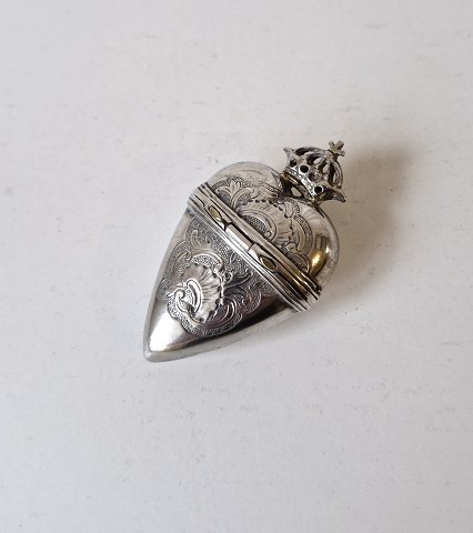 1900s heart-shaped head water jug in silver, adorned with crown and rococo decoration. Measures 4.2 x 7 cm. Appears without a stamp.