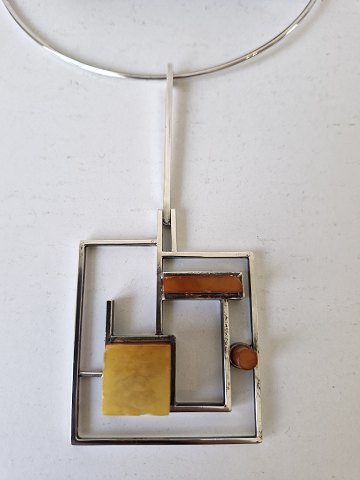 Bent Knudsen halsring i sterling sølv med grafik vedhæng prydet med rav