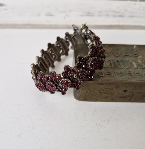 Leddelt armbånd prydet med talrige smukke mørke granater, armbåndet er forsynet med sikkerhedskæder.