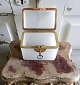 Meget eksklusivt 1800tals sukker/kandis skrin i hvid opalineglas med forgyldt bronze montering. Skrinet fremstår med nøgle, meget usædvanligt at nøglen følger med.