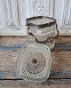 Beautiful old biscuit bucket in pressed glass with pewter mounting Measurements 12 x 12 cm. Height 19.5 cm.