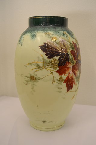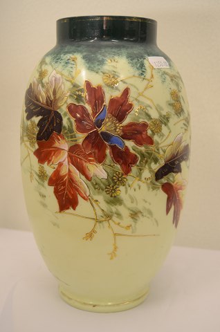 Meget velholdt antik glasvase i farven opalhvid bemalet med smukke blomster dekorationer og guldstrejf.