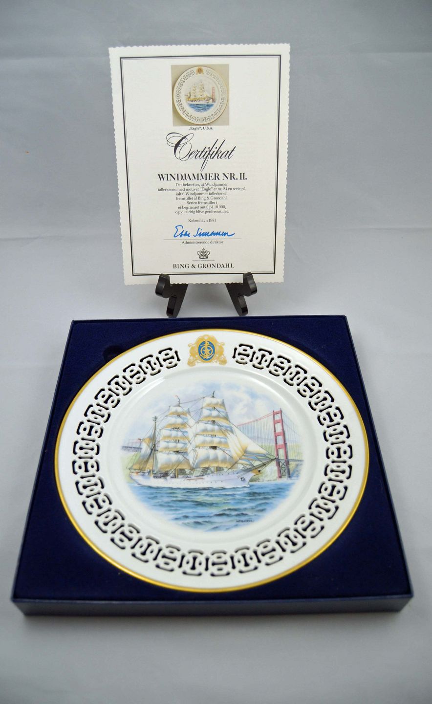 Windjammer seriens nr. 2 er motivet af skibet ‘Eagle’ fra USA. Platte nr. 8867/633. Den har en diameter på 27,5 cm. Platten er i perfekt stand, og den er klargjort til ophæng.