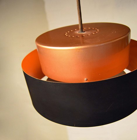 Kobberlampe model Saturn, designet af Jo hammerborg og produceret af Fog og Mørup i 1966. Pendel lampen er udformet af kobber og sortlakeret metal. Den er velholdt. Højde: 18 cm. Ø: 30 cm.