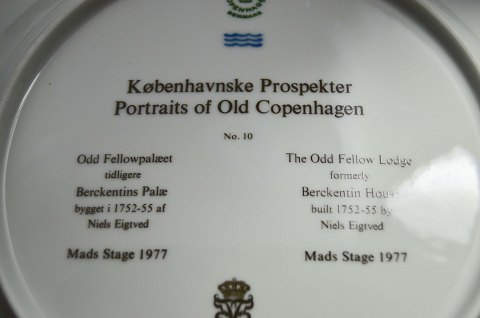 Platter fra Royal Copenhagen med motiver af Københavnske prospekter. Serien 'Københavnske prospekter' består af 12 platter/tallerkner, som hver især viser et motiv af et betydningsfuld historisk bygningsværk beliggende i København. Motiverne er tegnet af Mads Stage i 1977.