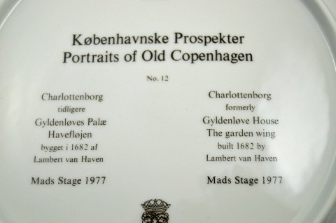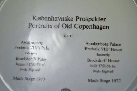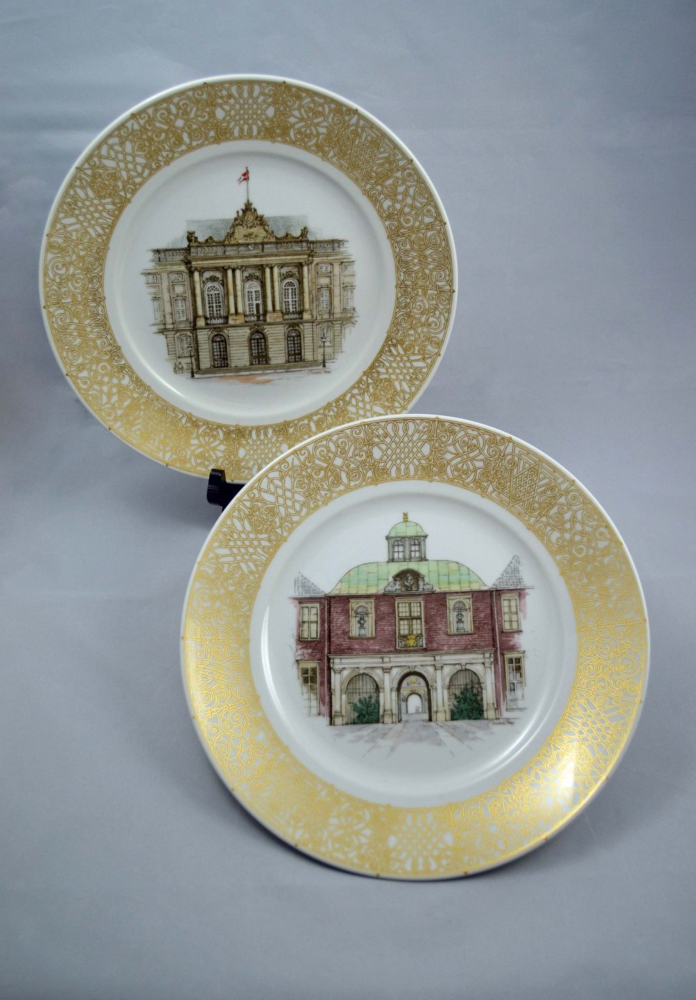 Platter fra Royal Copenhagen med motiver af Københavnske prospekter. Serien 'Københavnske prospekter' består af 12 platter/tallerkner, som hver især viser et motiv af et betydningsfuld historisk bygningsværk beliggende i København. Motiverne er tegnet af Mads Stage i 1977.