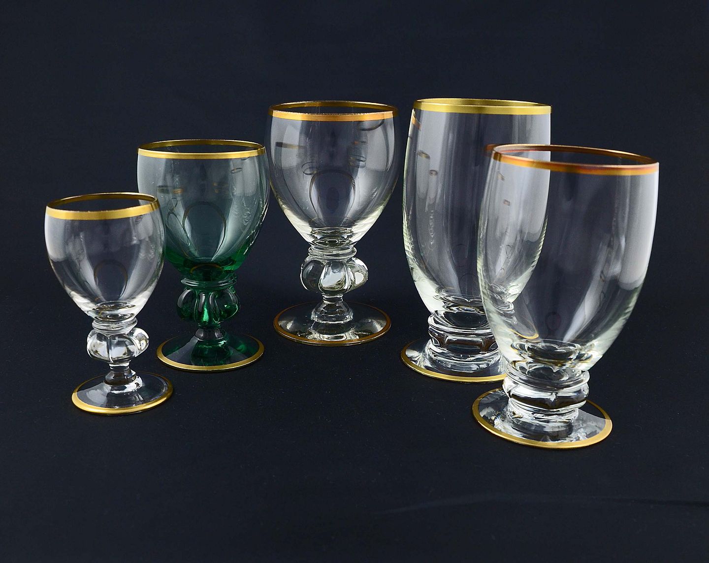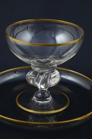 Gisselfeld glas med glat kumme, presset stilk og guldkant på rand og fod. Der er også is asietter til Gisselfeld serien
